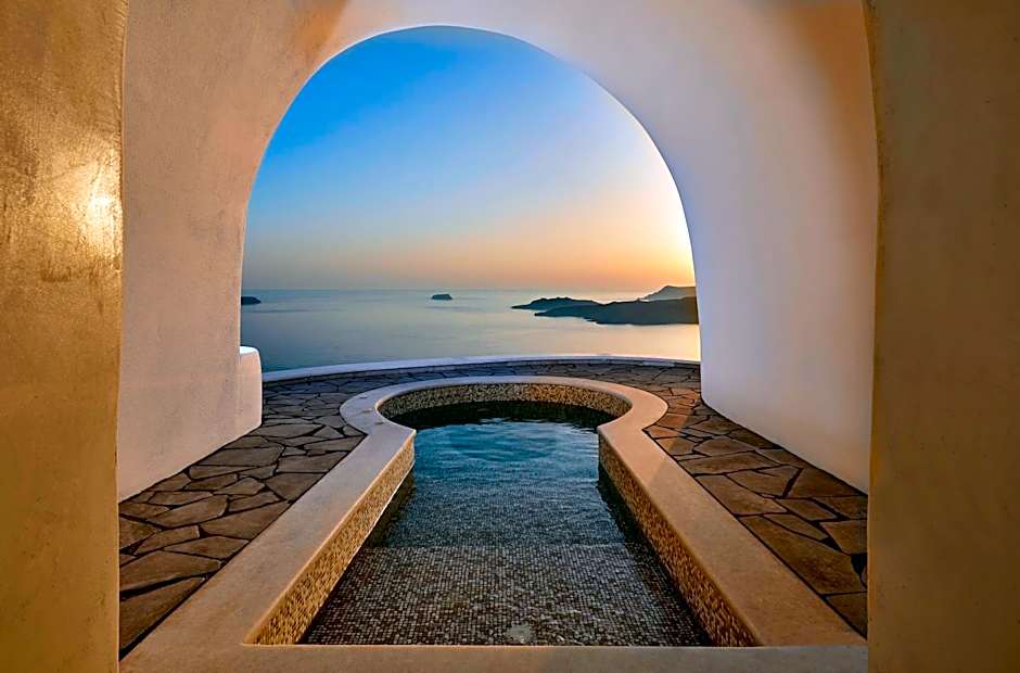 Premium Suite with private heated pool and caldera view is 377 square feet and includes a double bed 131-150 width.